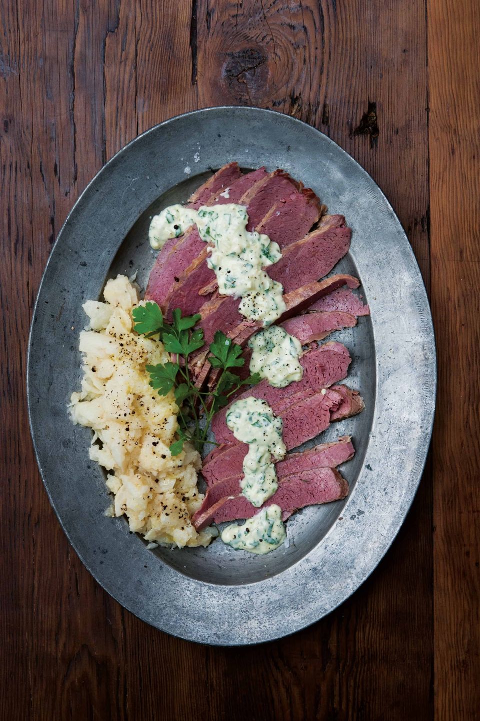 To serve, slice the beef against the grain onto a warmed platter and spoon the smashed turnips alongside. Pour the parsley sauce into a warmed jug and then over the meat when you are ready to serve.