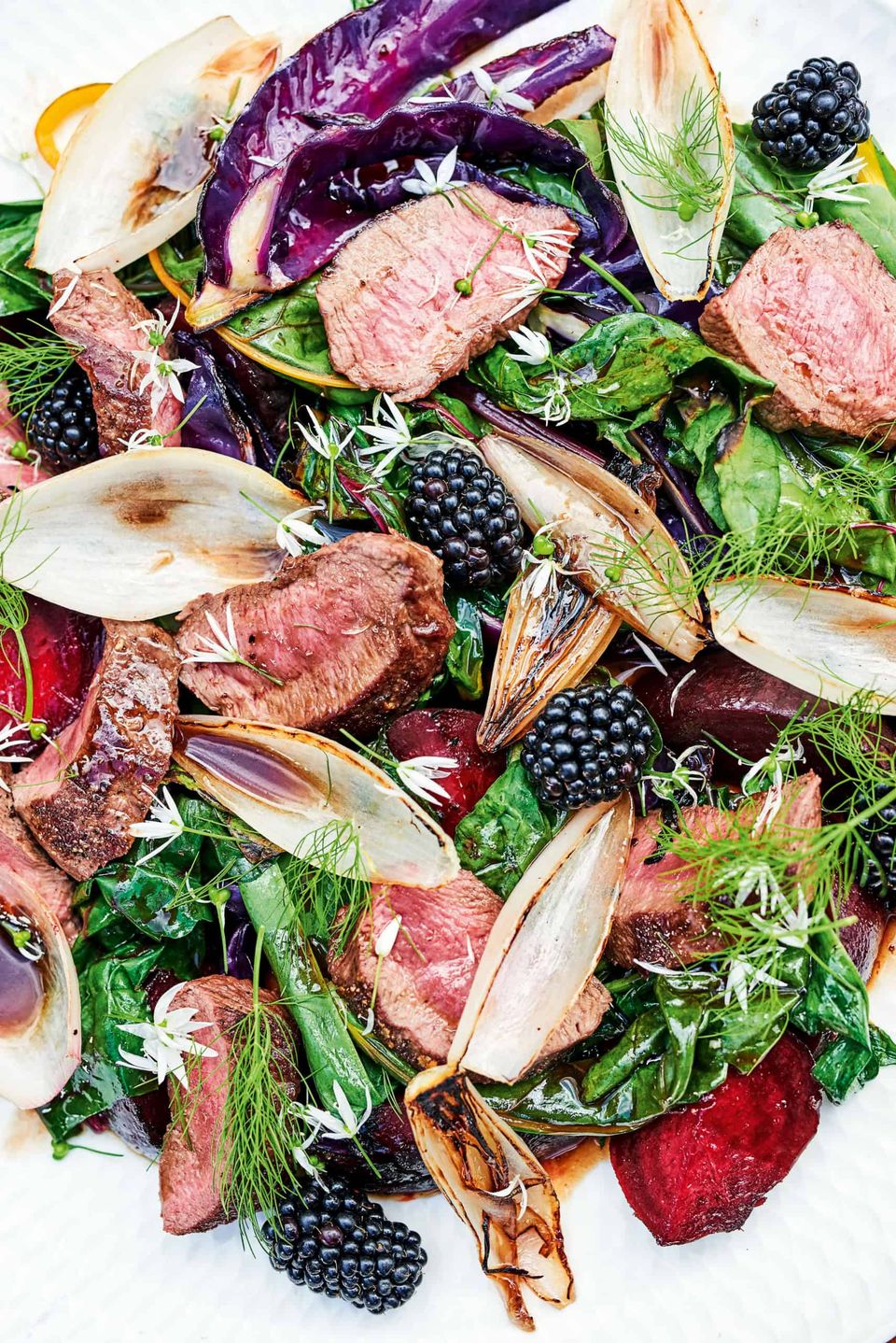 To serve, pile the vegetables onto a platter, separating the shallots into layers. Slice the meat and arrange on top, adding any rested juices to the sauce. Warm the sauce through, then spoon over the meat and vegetables. Finally, scatter over the blackberries, wild garlic flowers and a few fennel fronds.