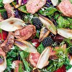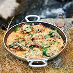 When the chicken is cooked, pour over the double cream and stir in the parsley. Add the wild garlic to the pan and cook for around one minute until it’s wilted, then remove from the heat, sprinkle the flowers over the top and serve.