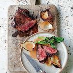 Slice the steak into 3cm thick slices and place on a platter with the broccoli, then spoon over the sauce. Pull the onions into petals and dot around before serving.