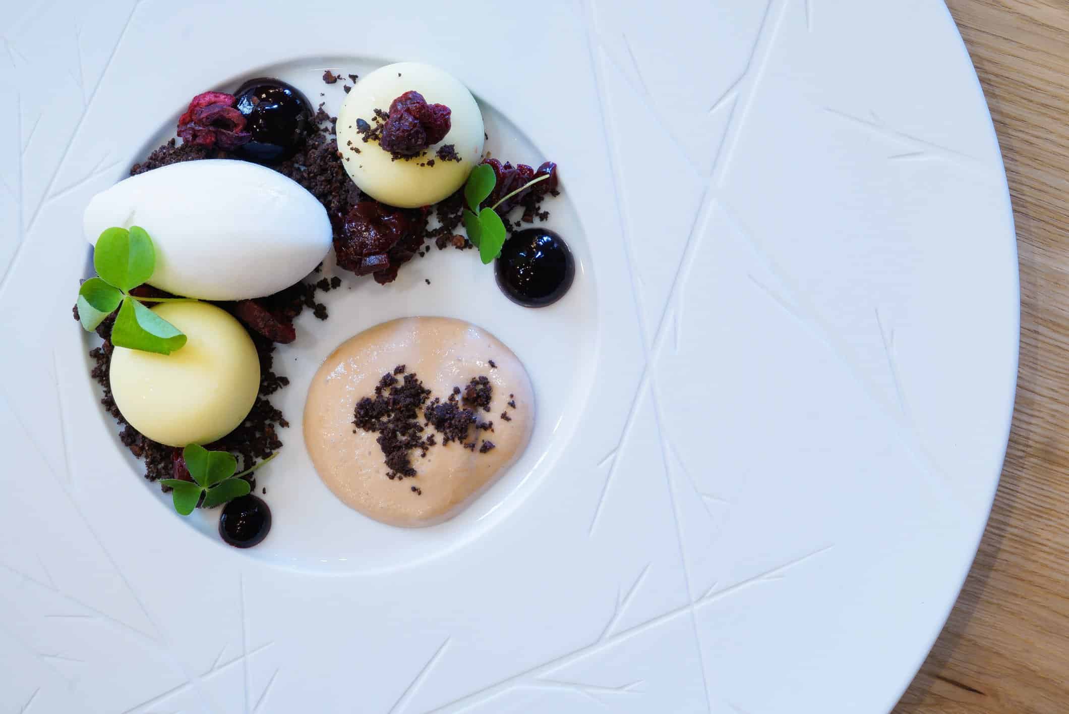 We may have been full by this point, but we were by no means finished. Aged Parmesan with crisp apple sorbet was a delightful play on the cheese course, and the chocolate and plum tart with Laphroaig mist was lovely.